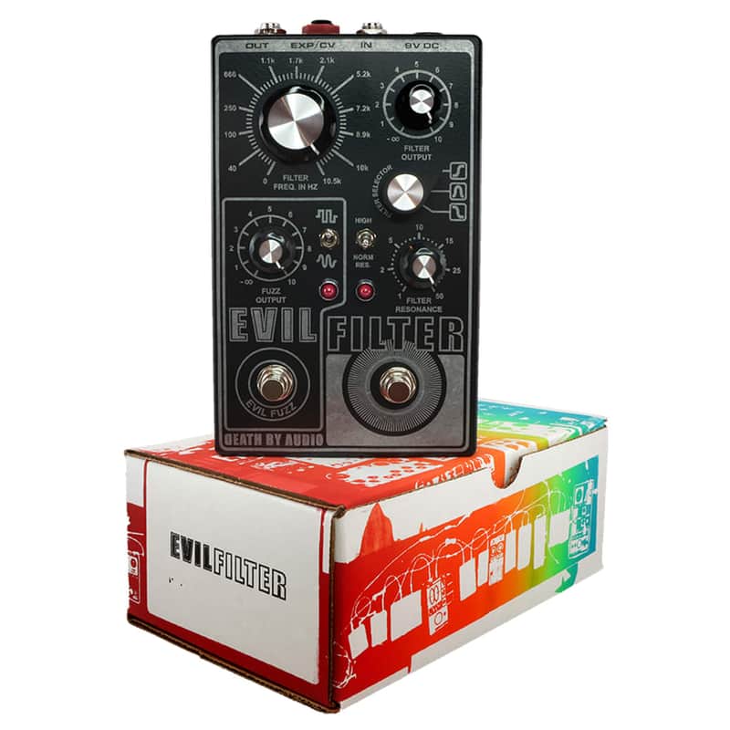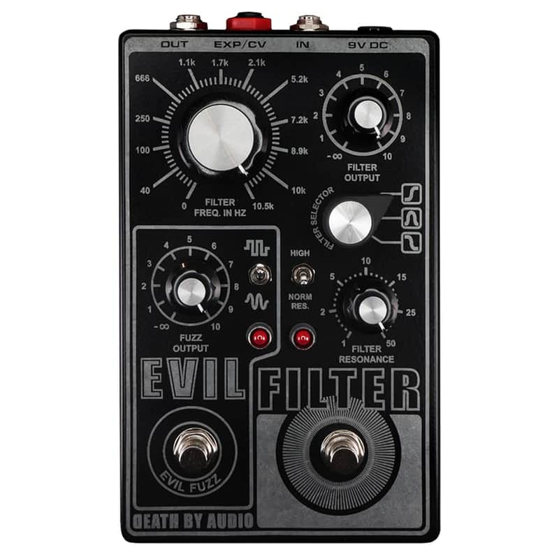 Psycho multimode filter with an ultra-sleek enclosure. Its medical-grade IC chip creates a hyper-precise filter that sounds like no other. With high pass, bandpass, and low pass modes, as well as two types of screaming resonance, the Evil Filter is ready to saw any sound into pieces - or just be the most insane wah you've ever heard. The Evil Filter's two fuzzes take signals into a much more twisted dimension, creating a blooming compression that's perfect for ripping solos and walls of noise alike. Push it past the limit into octaves up, down, and snarling wavefolding sounds. Using the CV/Expression input, you can also control the filter cutoff frequency with an expression pedal or synthesizer.