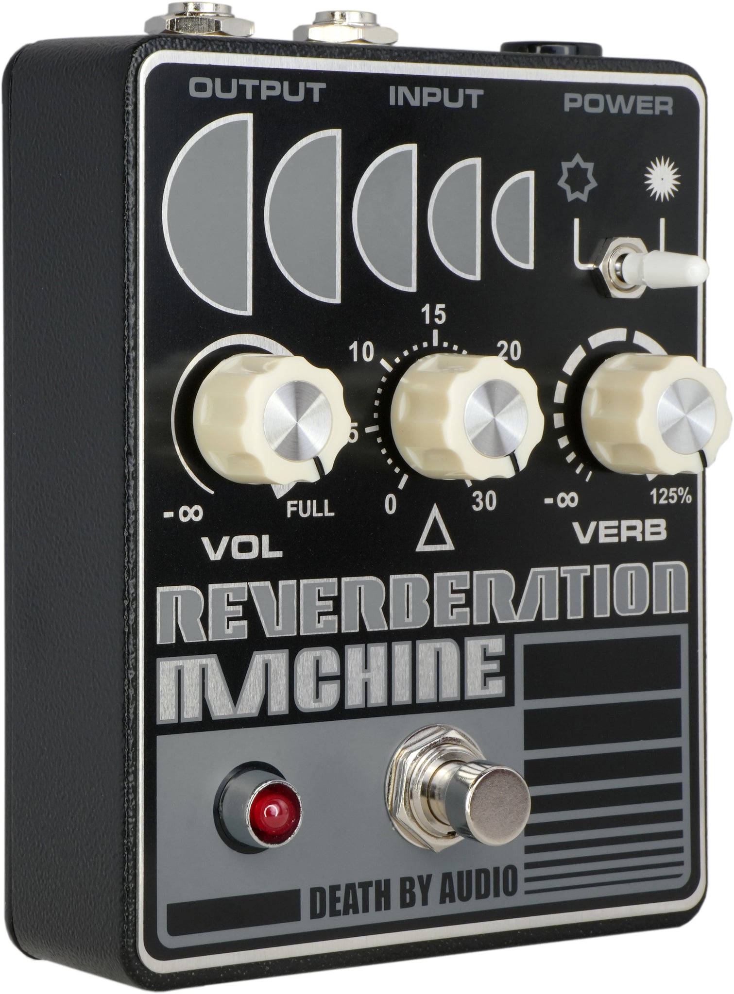 Maybe you've noticed the Reverberation Machine doesn't have regular reverb pedal controls. That's because it isn't a regular reverb pedal. Unless you want it to be. You're operating this machine. In true Death By Audio fashion, the VERB control goes all the way to 125% wet for trippy psyched-out reverbs that are louder than the input! This thing gets intense!