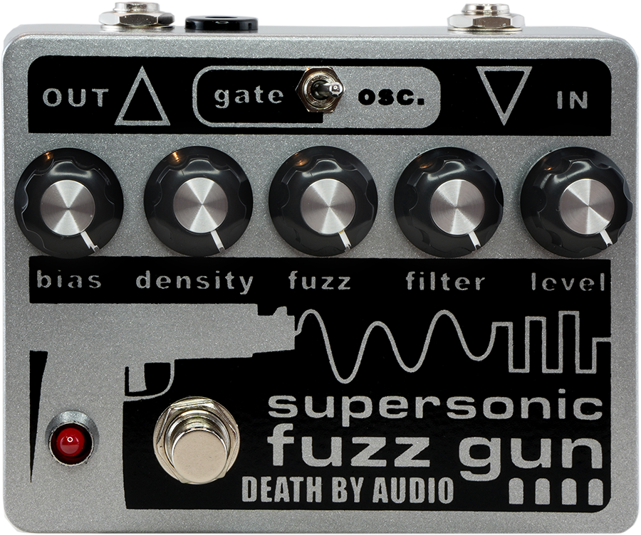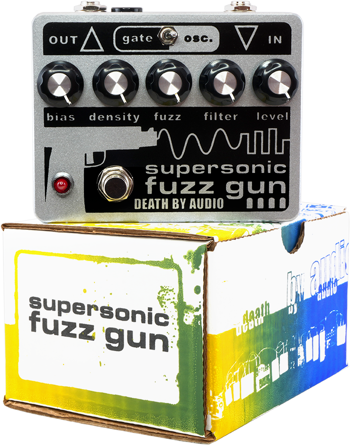 The Supersonic Fuzz Gun is a completely unique take on a fuzz pedal made with the extremes of manipulation in mind. The controls interact with one another to create a huge array of gated and oscillating fuzz sounds. It can scream, it can blast, it can implode, it can doom, and it can gloom. Possible sounds vary from (relatively) straightforward distorted guitar to shards of total insanity. This pedal is well at home making its own howls, chirps, growls, and sputters - harness the unruliest electric destroyer we make with the Supersonic Fuzz Gun.