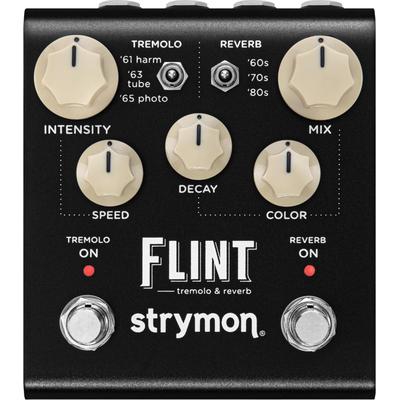 The magical combination of tremolo and reverb is the earliest example of a perfect guitar effects marriage. First pioneered within historic amplifiers of the 1960s, this harmonious coexistence has made its way onto countless records and performances — from early surf, swampy bayou blues, spaghetti westerns and film noir soundtracks, to modern day indie rock. As music moves forward, guitarists continue rediscovering the inspiration provided by this perfect pair.Flint is a studio-class effects pedal that delivers this classic combination. We carefully studied our favorite classic tremolo and reverb circuits, examined the sonic complexities and faithfully accounted for every detail in our hand-crafted algorithms. Flint is essentially two pedals in one, with tremolo on one half and reverb on the other.Flint gives you the pulsating, soothingly hypnotic effects pioneered in vintage amplifier tremolo circuits, along with three classic and completely unique reverb algorithms.On the tremolo side of the pedal you can choose between the sonically complex ’61 Harmonic Tremolo, the swampy and sultry ’63 Power Tube Tremolo, and the sharp and balanced ’65 Photocell Tremolo. On the reverb side you can select the classic ’60s Spring Tank Reverb, the inventive ’70s Electronic Plate Reverb, or the nostalgic ’80s Hall Rack Reverb.Power Supply: 9V;AdapterNumber of Buttons: 2Inputs: Jack 6,3 mmControls: Color;Decay;Intensity;Mix;Switch;SpeedPackage Contents: Adapter;ManualColour: BlackRackmountable: NoBattery Operation: NoTuner: NoOutputs: Jack 6,3 mmMade in: USAype: Tremolo;ReverbUK/EU Power supply included: YesUSB: YesTrue Bypass: Yes.