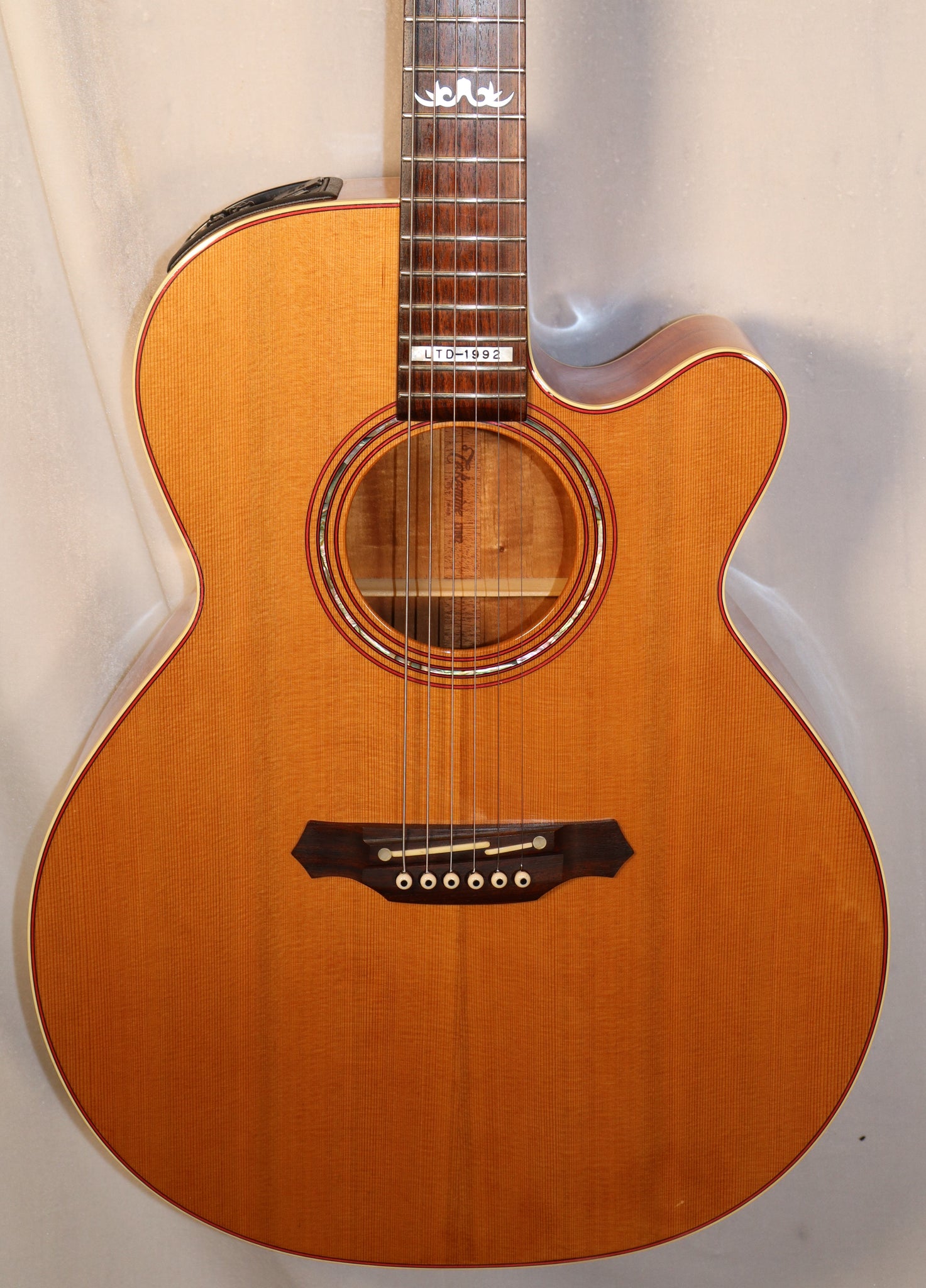 1992 Takamine LTD-1992 Limited Edition Koa Back and Sides Cedar Top Acoustic Electric Guitar with case. Setup for optimal playability with Daddario 12-53 strings (9/26/25). There is a scratch and a ding on the lower bout treble side. s/n 92010126