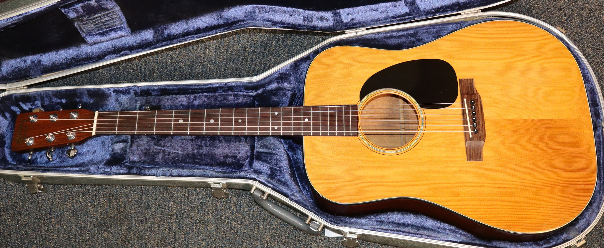 vintage 1970 Martin D-18 Dreadnought Acoustic Guitar with original case. Cleaned and Setup for optimal playability with Daddario EJ16 12-53 (10/30/25). The case is functional but see pictures of hinges - may soon need to be replaced. There is a decal on the back of the headstock.